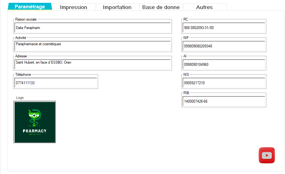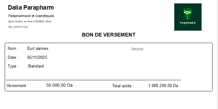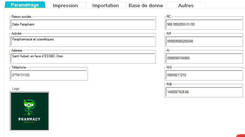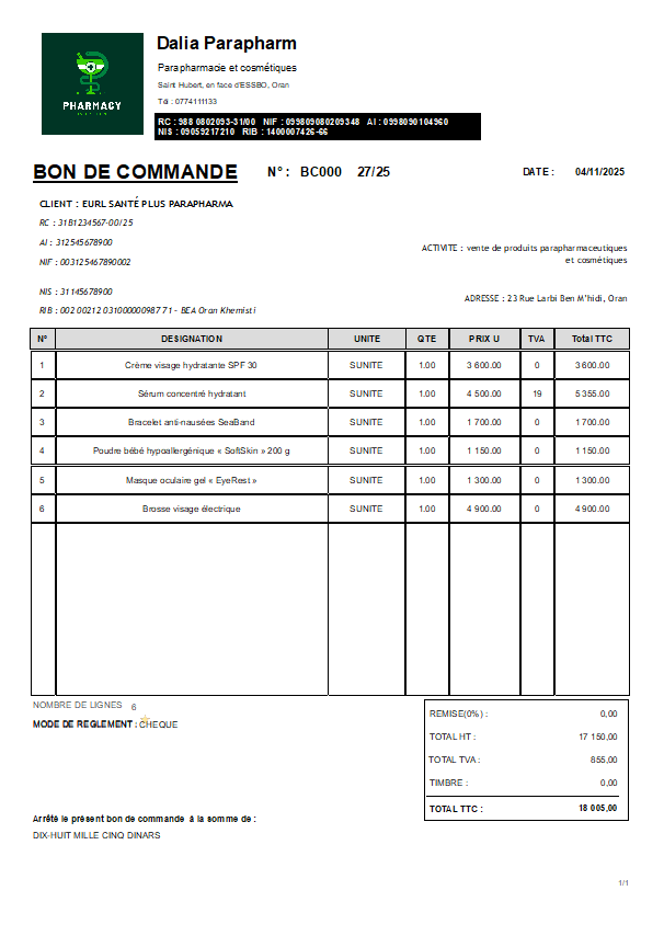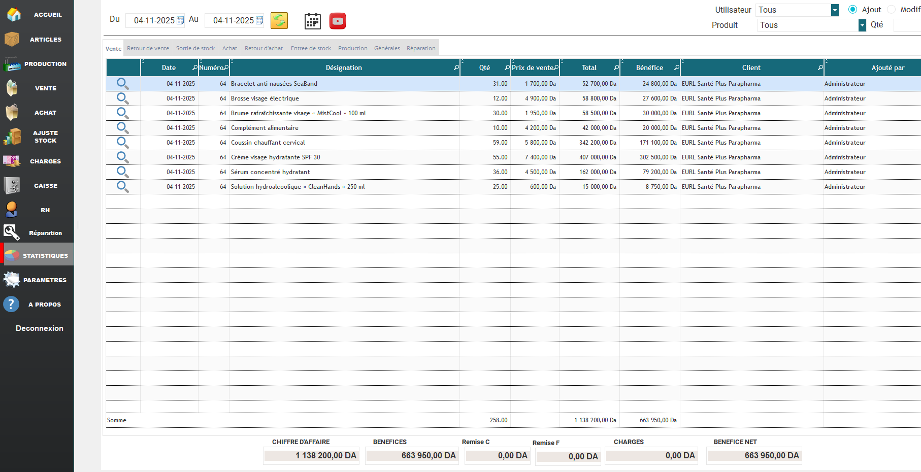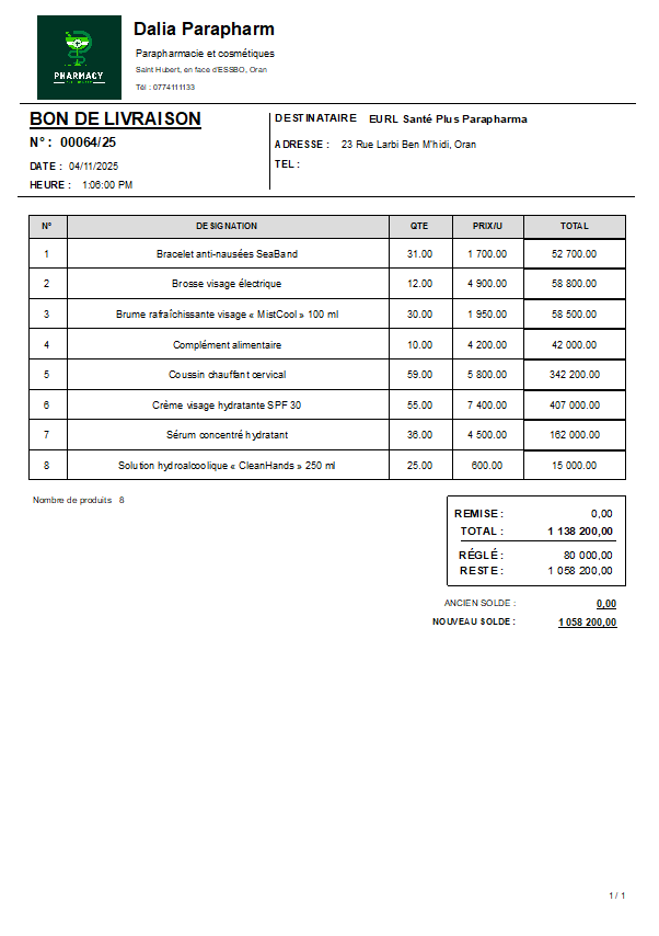Dolisoft Parapharmacie est un logiciel complet et moderne conçu spĂ©cialement pour les parapharmacies et Ă©tablissements de produits de santĂ©. Il gĂšre vos stocks, vos ventes, vos clients et vos fournisseurs avec prĂ©cision, tout en respectant les normes de gestion : lots, pĂ©remption, TVA, traçabilitĂ©, et facturation conforme Ă la loi algĂ©rienne. Stable, rapide et simple Ă utiliser, câest lâoutil idĂ©al pour une gestion claire, fluide et sans erreurs.