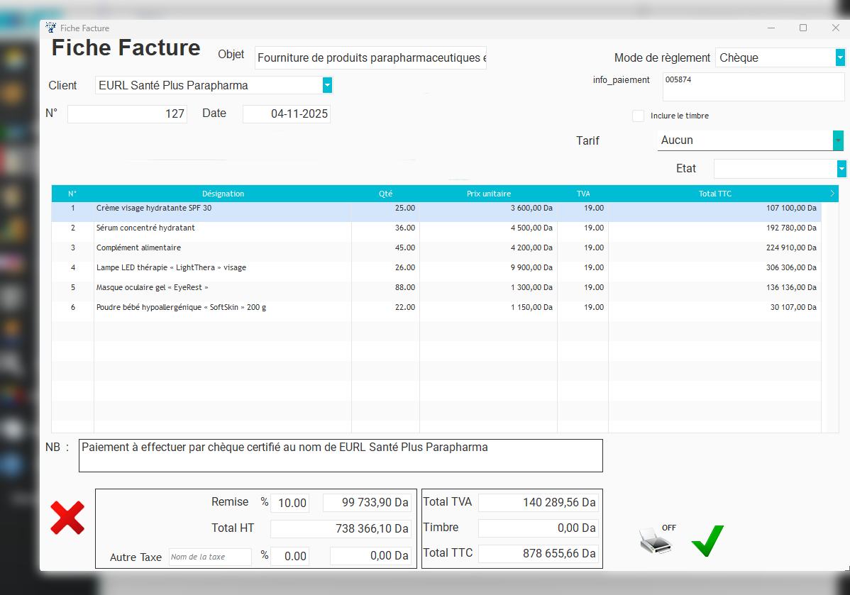 - Calcul automatique de la TVA, des remises (en % ou montant fixe) et du timbre fiscal 2025.